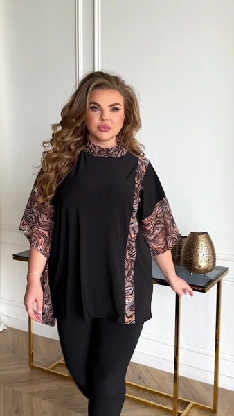 Туніка вільного фасону спадаюча, з вставками шифону. Лосіни облягаючі, пояс на резинці.