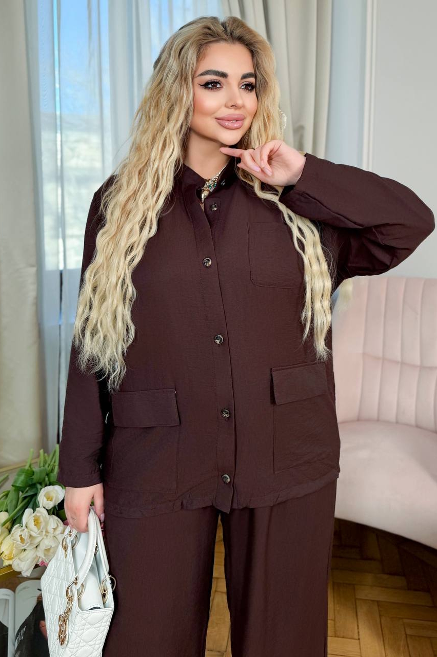 Сорочка подовжена на гулзиках, комір стійка. Штани палаццо вільного крою, пос на резинці, по боках кишені.