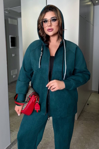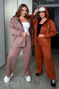 Костюм складається з вільної кофти на змійці та прямих штанів із комфортною посадкою. Продуманий крій гарно сідає по фігурі, візуально витягує силует і підходить для plus size.