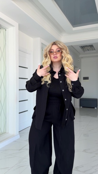 Сучасний костюм однотонного кольору. Сорочка - вільного крою, на рукавах є хлястик, можна підкотити рукав та зафіксувати його. Є кишеня.
