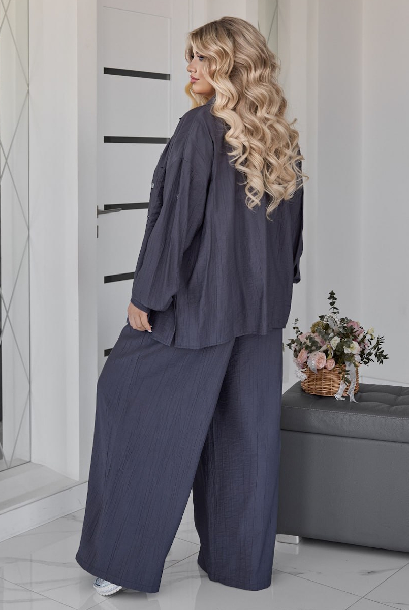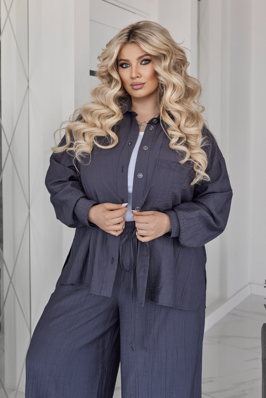 Сучасний костюм однотонного кольору. Сорочка - вільного крою, на рукавах є хлястик, можна підкотити рукав та зафіксувати його. Є кишеня.