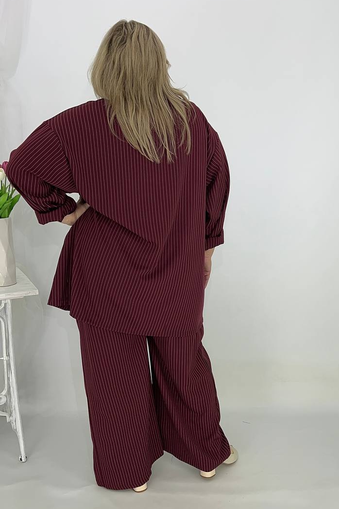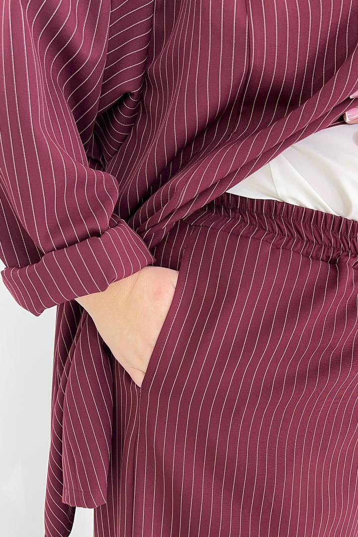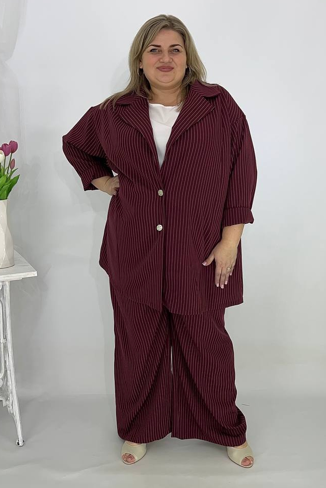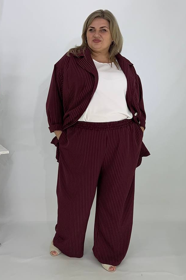 Піджак класичний, без підкладки, відкладний комір, на гудзику. Штани широкі, пояс на резинці, по боках кишені.