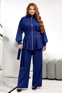Штани прямого силуету з легким звуженням донизу, ідеальної посадки, пояс на широкій резинці з контрастним шнурком для регулювання об’єму, зручні бокові кишені, вертикальні рельєфні шви, що візуально подовжують силует. Низ штанин — на манжеті, прикрашені невеличкою лаконічною наліпкою.