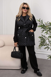 Стильний жіночий костюм-трійка, що складається з жилета, світшота та штанів. Жилет стьобаний, подовжений. Має відкладний комір із лацканами, накладні кишені з ґудзиками та пояс, який підкреслює талію. Малюнок простьобування – геометричний, додає виразності образу.