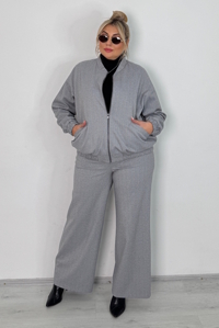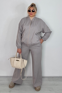 Бомбер трендового покрою, спущений рукав, низ виробу та рукав на резинці, застібка змійка. Брюки палаццо класика, притачний пояс, застібка на змійку та гудзик, є бокові кишені.