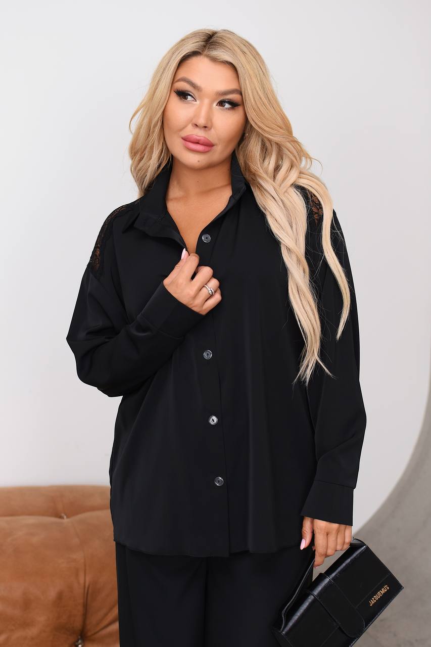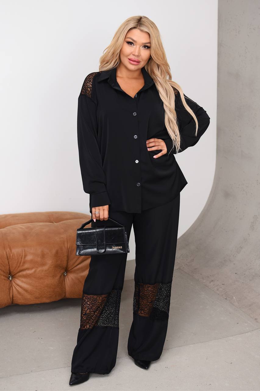 Сорочка на ґудзиках, комір стійка, по спинці вставка дороге кружево. Штани палаццо, талія на резинці, низ на фіксаторах, за допомогою яких можно регулювати ширину, вставки кружево.