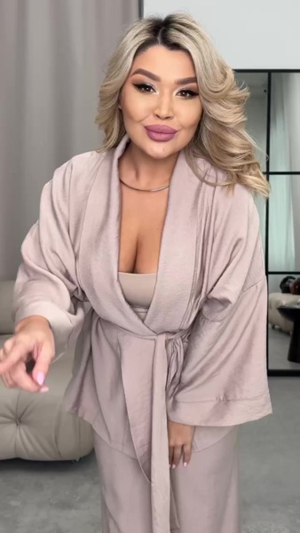 Жакет вільного крою, зі спущеною лінією плеча, рукав 3/4, без застібки. Брюки прямі, вільні, на талії еластична резинка, з кишенями у бічних швах, пояс в комплекті.