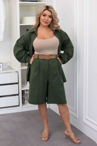 Подовжені шорти-бермуди зі стрілками. Лінія талії висока, що прекрасно підкреслює жіночність. Доповнити образ можна тканинним чи шкіряним ремінцем. Присутні бічні кишені. Чудовою парою такому костюму стануть як босоніжки на підборах, так і сандалі на низькому ходу чи кеди.