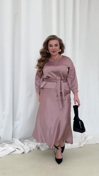 Спущена лінія плечей та рукави довжиною 3/4 з манжетами на ґудзиках забезпечують стильний вигляд і зручність. Довга спідниця на резинці комфортно сідає по фігурі, а текстильний пояс, що входить до комплекту, дозволяє підкреслити талію та додає завершеності образу. Цей виріб створений, щоб ви відчували себе впевнено й виглядали розкішно під час зустрічі Нового року чи будь-якого іншого особливого заходу.