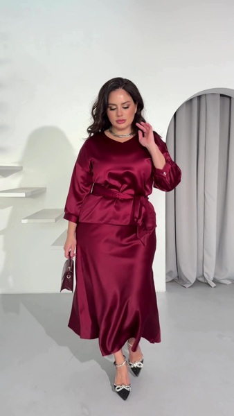 Спущена лінія плечей та рукави довжиною 3/4 з манжетами на ґудзиках забезпечують стильний вигляд і зручність. Довга спідниця на резинці комфортно сідає по фігурі, а текстильний пояс, що входить до комплекту, дозволяє підкреслити талію та додає завершеності образу. Цей виріб створений, щоб ви відчували себе впевнено й виглядали розкішно під час зустрічі Нового року чи будь-якого іншого особливого заходу.