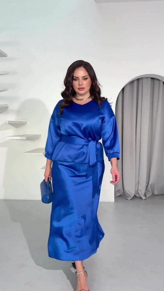 Спущена лінія плечей та рукави довжиною 3/4 з манжетами на ґудзиках забезпечують стильний вигляд і зручність. Довга спідниця на резинці комфортно сідає по фігурі, а текстильний пояс, що входить до комплекту, дозволяє підкреслити талію та додає завершеності образу. Цей виріб створений, щоб ви відчували себе впевнено й виглядали розкішно під час зустрічі Нового року чи будь-якого іншого особливого заходу.