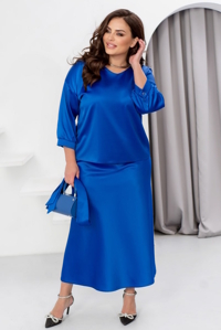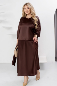 Спущена лінія плечей та рукави довжиною 3/4 з манжетами на ґудзиках забезпечують стильний вигляд і зручність. Довга спідниця на резинці комфортно сідає по фігурі, а текстильний пояс, що входить до комплекту, дозволяє підкреслити талію та додає завершеності образу. Цей виріб створений, щоб ви відчували себе впевнено й виглядали розкішно під час зустрічі Нового року чи будь-якого іншого особливого заходу.