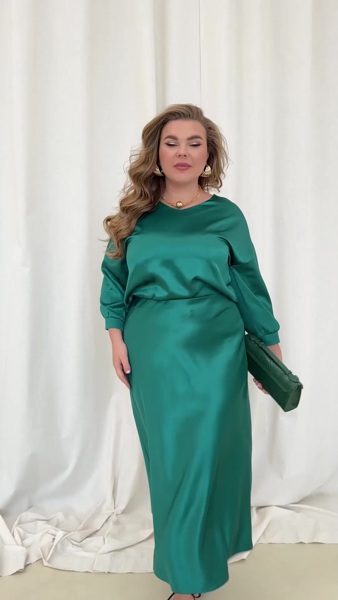 Спущена лінія плечей та рукави довжиною 3/4 з манжетами на ґудзиках забезпечують стильний вигляд і зручність. Довга спідниця на резинці комфортно сідає по фігурі, а текстильний пояс, що входить до комплекту, дозволяє підкреслити талію та додає завершеності образу. Цей виріб створений, щоб ви відчували себе впевнено й виглядали розкішно під час зустрічі Нового року чи будь-якого іншого особливого заходу.