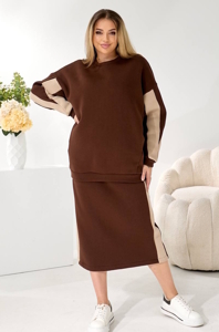 Світлот вільного крою з боковими кишенями, горловина окргула. Спідниця приталена, нижче коліна, пояс на резинці.