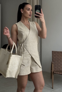 Жилет на запах. Шорти високої посадки з поясом на широкій резинці, з двома кишенями.