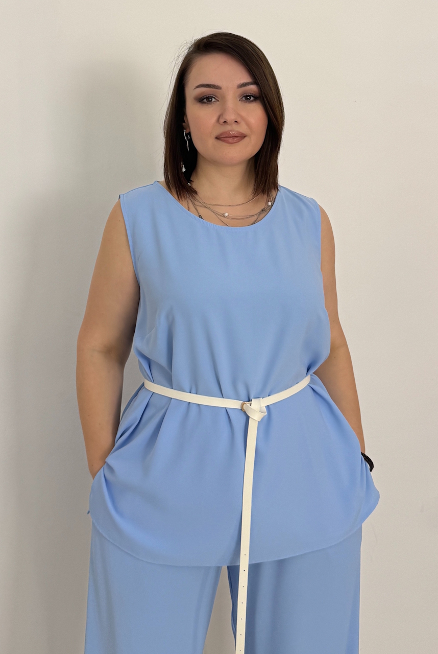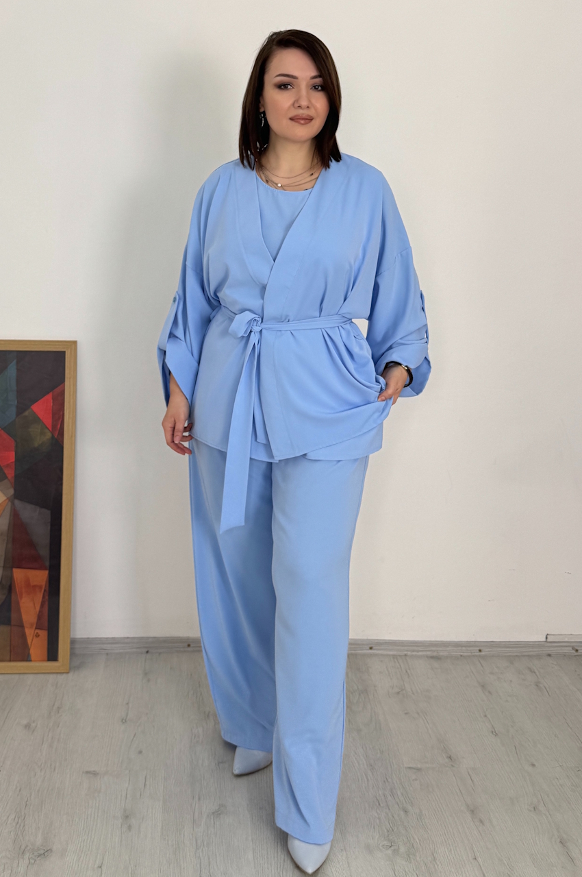 Сорочка вільного силуету по типу кімоно, рукав довгий, що регулюється хлястиком, талію можна підкреслити пояском. Широкі штани-палаццо на високій посадці, пояс на резинці, по боках кишені. Майка вільного фасону. Легка тканина приємна на дотик, не парить, не просвічується.