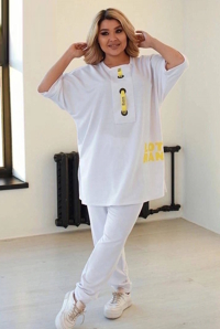 Верх - футболка, в якій широкі та короткі рукава, що закінчуються манжетами ( можна закочуваати при потребі).Спереді красива вставка на виробі, яка додає стилю. Низ - штани спортивні, які на манжетах. Пояс - на резинці.