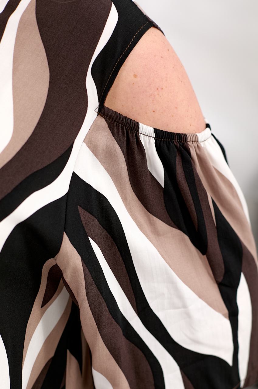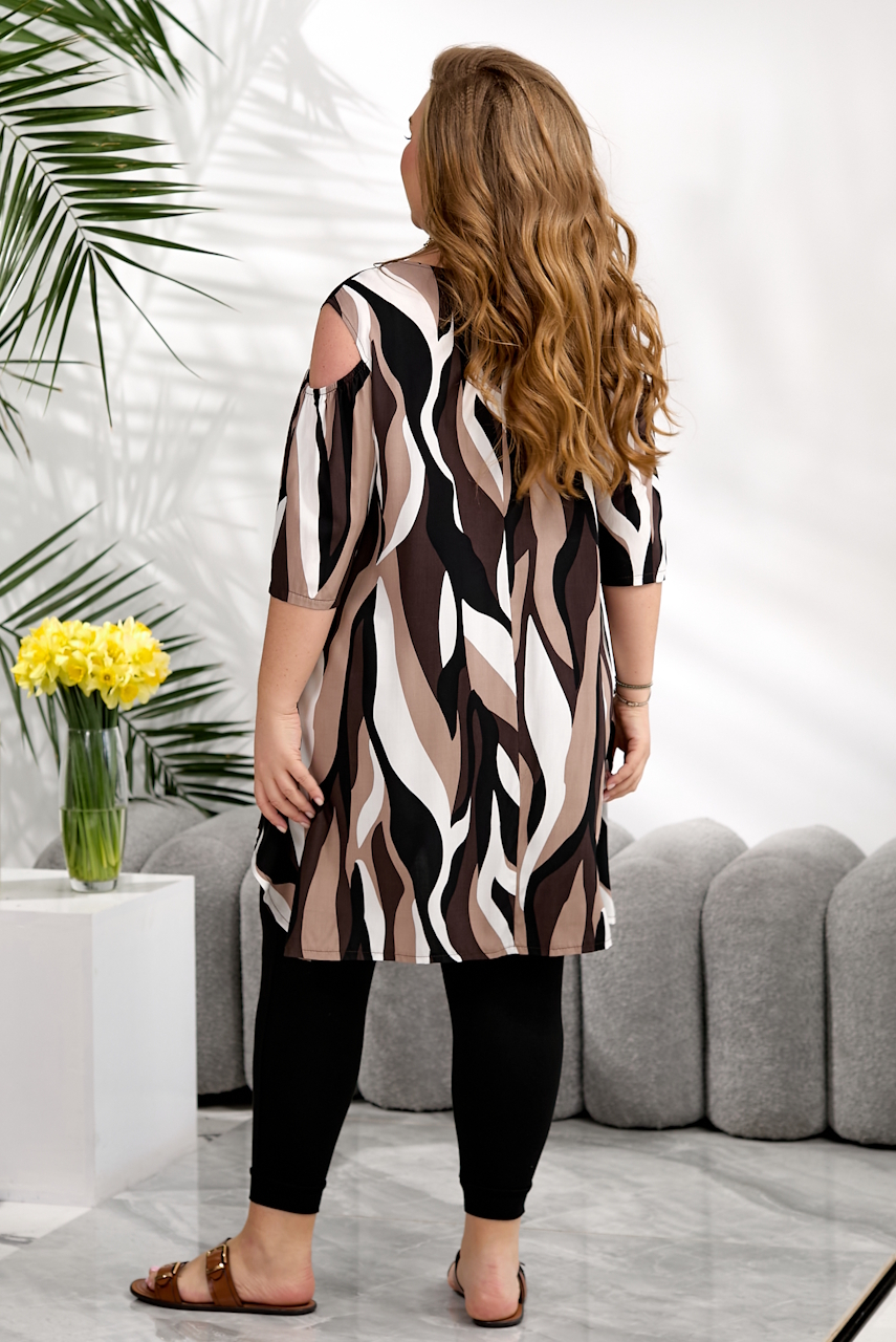 Туніка вільного фасону з фалдами по боках, силует трапеція, розширена донизу, на рукавах цікаві розрізи.