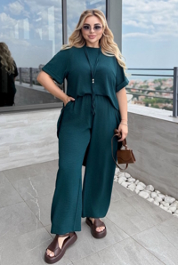 Асиметрична, вільна туніка, маскує зону живота та стегон. Прямі штани візуально витягують силует. Штани на резинці, діючі бокові кишені. Костюм можна поєднувати як з низьким ходом, так і підборами.
