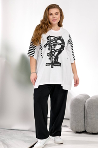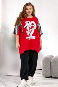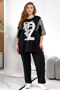 Футболка подовжена, комбінована, вільного фасону. Штани прямого силуету, пояс на резинці, посадка висока, низ можна стягнути для зручності.