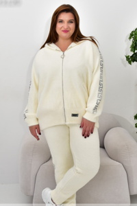 Комплект складається з подовженої кофти вільного крою на блискавці з капюшоном і зручних штанів. Кофта має практичні кишені та спущену лінію плеча, що додає образу невимушеності, а декоративні елементи на рукавах надають модного акценту. Штани з комфортною посадкою м’яко прилягають до фігури, не сковують.