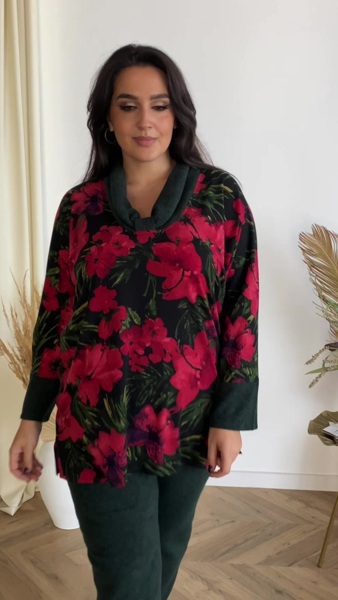 Подовжена тепла туніка вільного силуету з суцільнокроєним рукавом. Горловина доповнена хомутком, рукав 7/8 вільний, на широкому манжеті.