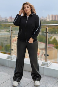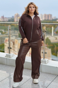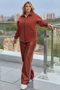Костюм складається з кофти та брюк. Кофта вільного крою з коміром та застібкою-блискавкою. Має зручні бічні кишені, декоровані вставками зі шкіри. Довгі спущені рукави прикрашені лампасами та завершуються еластичними манжетами. Брюки із завищеною талією та прямим вільним кроєм. Спереду – вставки зі штучної шкіри, ззаду – м’яка тринитка. Пояс на резинці забезпечує комфортне прилягання. Бокові лампаси додають спортивного акценту.