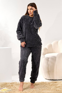 М’який костюм-двійка, зшитий з полірованої махри з рельєфним візерунком (ялинка/ромб). Ця тканина забезпечує максимальний комфорт і затишок, ідеально підходить для домашнього відпочинку або прогулянок у прохолодну пору року. Виріб складається з кофти та штанів. Кофта прямого крою з округлим вирізом горловини. Довгі рукави зібрані на м'який манжет, що гарантує зручну фіксацію.