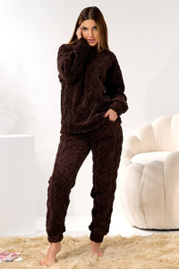 М’який костюм-двійка, зшитий з полірованої махри з рельєфним візерунком (ялинка/ромб). Ця тканина забезпечує максимальний комфорт і затишок, ідеально підходить для домашнього відпочинку або прогулянок у прохолодну пору року. Виріб складається з кофти та штанів. Кофта прямого крою з округлим вирізом горловини. Довгі рукави зібрані на м'який манжет, що гарантує зручну фіксацію.