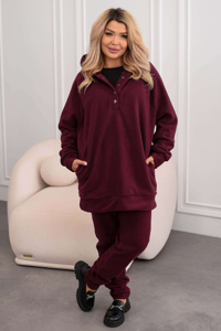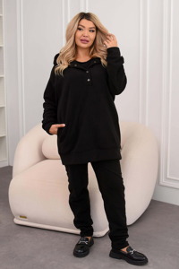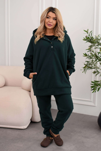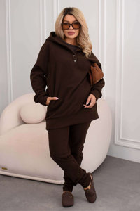 Теплий зручний костюм-трійка – базова річ для повсякденного гардеробу. Кофта-худі фасону оверсайз. Виріб подовжений, повністю закриває стегна. Має капюшон. Спереду розташована коротка планка на ґудзиках (поло-застібка) у зоні горловини. Є великі накладні кишені з боків.