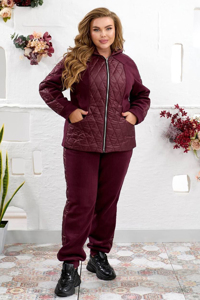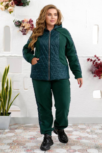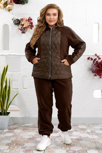 Теплий практичний костюм, зшитий з поєднання флісу полар преміум якості та стьобаної плащівки з наповнювачем. Це ідеальний вибір для прохолодної погоди. Виріб складається з куртки та штанів. Куртка прямого крою з капюшоном та повністю на підкладці. Передня частина моделі виконана зі стьобаної плащівки з геометричним візерунком, а рукави та спинка – з м'якого флісу. Виріб застібається на центральну блискавку. З боків розташовані зручні прорізні кишені.