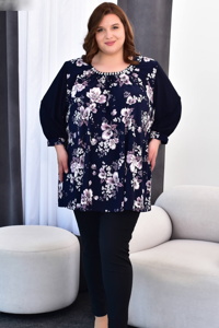 Силует легка трапеція, по горловині призібрано та декоровано перлинками. Рукав 3/4.