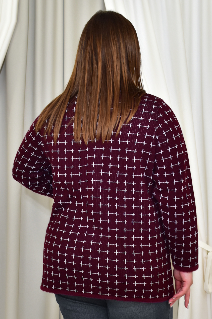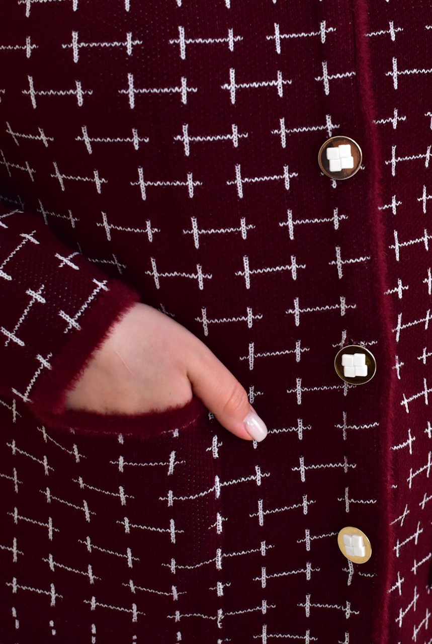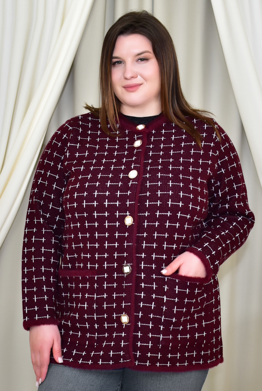Модель прямого крою, виконана в актуальних відтінках з делікатним геометричним візерунком, що додає виробу вишуканості. Застібається на великі декоративні ґудзики.