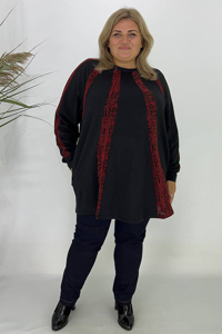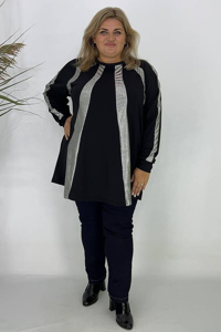 Туніка вільного крою поєднує в собі комфорт та цікавий дизайн. Модель виготовлена з трикотажу двонитки чорного кольору, що робить її практичною для повсякденного носіння. Її оригінальна риса – декоративні смуги, які проходять по центру спереду та на рукавах. Ці смуги мають виразну текстуру, схожу на щільне плетіння або "рогожку", що створює контраст із гладкою поверхнею основної тканини.