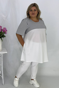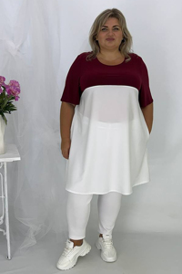 Туніка має стильний і сучасний дизайн, який підійде для жінок з формами. Верхня частина туніки виконана у насиченому бордовому кольорі, а нижня – в контрастному білому. Такий поділ по горизонталі візуально балансує фігуру. Рукави короткі, крій туніки вільний і трохи розкльошений донизу, що забезпечує комфорт і не сковує рухів.
