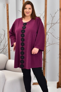 Модель має вільний прямий крій, довгий рукав та округлий виріз горловини. Центральною прикрасою є вертикальна смуга з об’ємних чорних квітів з декоративними намистинами, яка візуально подовжує силует і додає акценту образу.