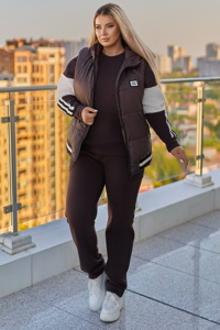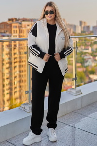 Жилет стьобаний з утеплювачем 150, доповнений капюшоном і застібкою-блискавкою. Має зручні бокові кишені, декорований лампасною стрічкою по низу та капюшону, а також нашивкою на грудях. Всередині – підкладка з плащової тканини. Світшот вільного фасону з контрастними білими вставками на рукавах, прикрашеними лампасною стрічкою. Штани з високою посадкою, обладнані кишенями та еластичним поясом, прямі по низу