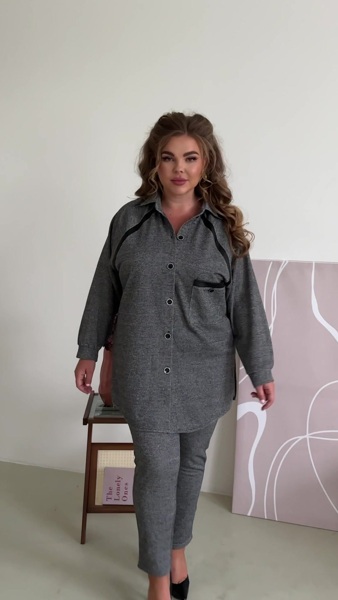 Сорочка вільного фасону, подовжена, рукав реглан, на гудзиках. Штани приталені, пояс на резинці, посадка вище середньої.