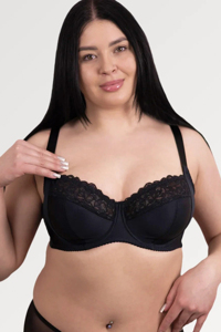 Бюстгальтер з м'якими чашками на каркасах з бічною коригучою деталлю і пружними пластинами в бічних деталях стану з трикотажного, еластичного полотна і мережива.