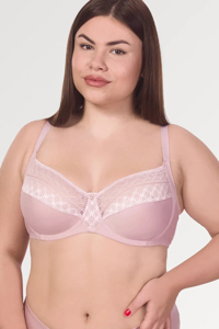 Бюстгальтер з м’якими чашками на каркасах для ідеальної підтримки до розміру 100F. Верхня частина чашечок декорована ніжним та якісним німецьким мереживом з рівним краєм. Нижня частина – із трикотажного полотна. Спеціальна вертикальна вставка, дозволяє підібрати груди з бічних ділянок та центрує їх до середини.