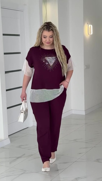 Блуза вільного силуету зі спущеними плечима, оздоблена модним принтом з камінцями та доповнена декоративною сіткою на рукавах і по краю. Штани також мають вільний крій у стилі "банан", звужені донизу, з поясом на еластичній резинці по талії та зручними кишенями.