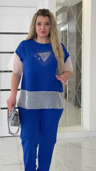 Блуза вільного силуету зі спущеними плечима, оздоблена модним принтом з камінцями та доповнена декоративною сіткою на рукавах і по краю. Штани також мають вільний крій у стилі "банан", звужені донизу, з поясом на еластичній резинці по талії та зручними кишенями.