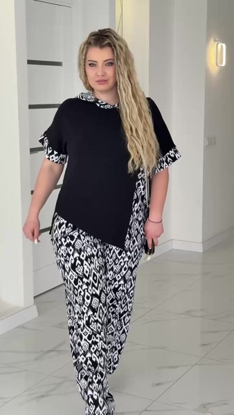 Блуза оригінального вільного крою з асиметричним низом та капюшоном створює виразний і сучасний образ. Штани вільного фасону з еластичним поясом і практичними кишенями доповнюють комплект комфортом і зручністю.