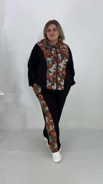 Кофта на змійці, є кишені та капюшон. Штани спортивні, пояс на широкій резинці, посадка висока.
