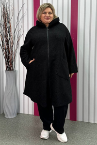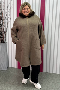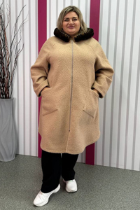 Силует виробу розкльошений, рукав реглан. З боків розташовані накладні кишені, дуже зручний капюшон з обробкою із щільного хутра-мутону леопардового забарвлення. Не кошлатиться після прання.