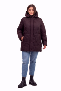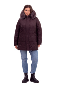 Тепла стьобана куртка має прямий крій та довжину до середини стегна, що робить її практичною для повсякденного носіння. Вона оснащена глибоким капюшоном, оздобленим розкішним хутром. Це хутро додає моделі елегантності та тепла. Вся поверхня куртки прошита фігурами різного розміру, що створює цікаву та фактурну поверхню.