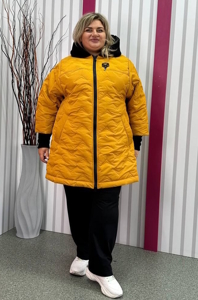 Силует легка трапеція, гарно сідає на будь який тип фігури. Рукав втачний довжиною 3/4, який доповнений широким манжетом дов'язом. Капюшон вшитий, якісна підкладка чорного кольору, застібка змійка, врізні кишені для дрібничок.
