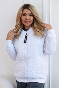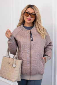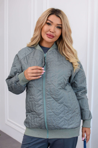 Сучасна жіноча стьобана куртка-бомбер. Класична модель має вільний, злегка об'ємний силует, комір-стійку, манжети на рукавах та пояс-резинку внизу. Куртка виготовлена з плащової тканини.