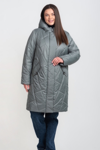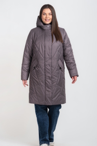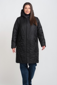 Жіноча куртка зі знімним капюшоном - приклад того, що верхній одяг великих розмірів може бути ефектною і стильною. З обох сторін вироби присутні дві зручних накладних кишені, в яких можна зберігати необхідні дрібниці. Комір-стійка і знімний капюшон захищають від холоду, дозволяючи обходитися без головного убору. Застібається модель на блискавку і планку на кнопках. Оригінальності додають геометричні рядки на спинці, поличці і рукавах.