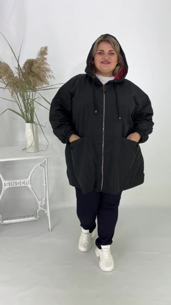 Комфортна вітрівка-куртка, зшита з плащової тканини Канада. Тканина має гарну якість, водонепроникна та вітронепроникна, що забезпечує надійний захист у негоду. Модель має вільний, об'ємний крій (оверсайз), що забезпечує комфортну посадку та м'яко приховує недоліки фігури. Підкладка виконана на флісі, що забезпечує додаткове тепло.